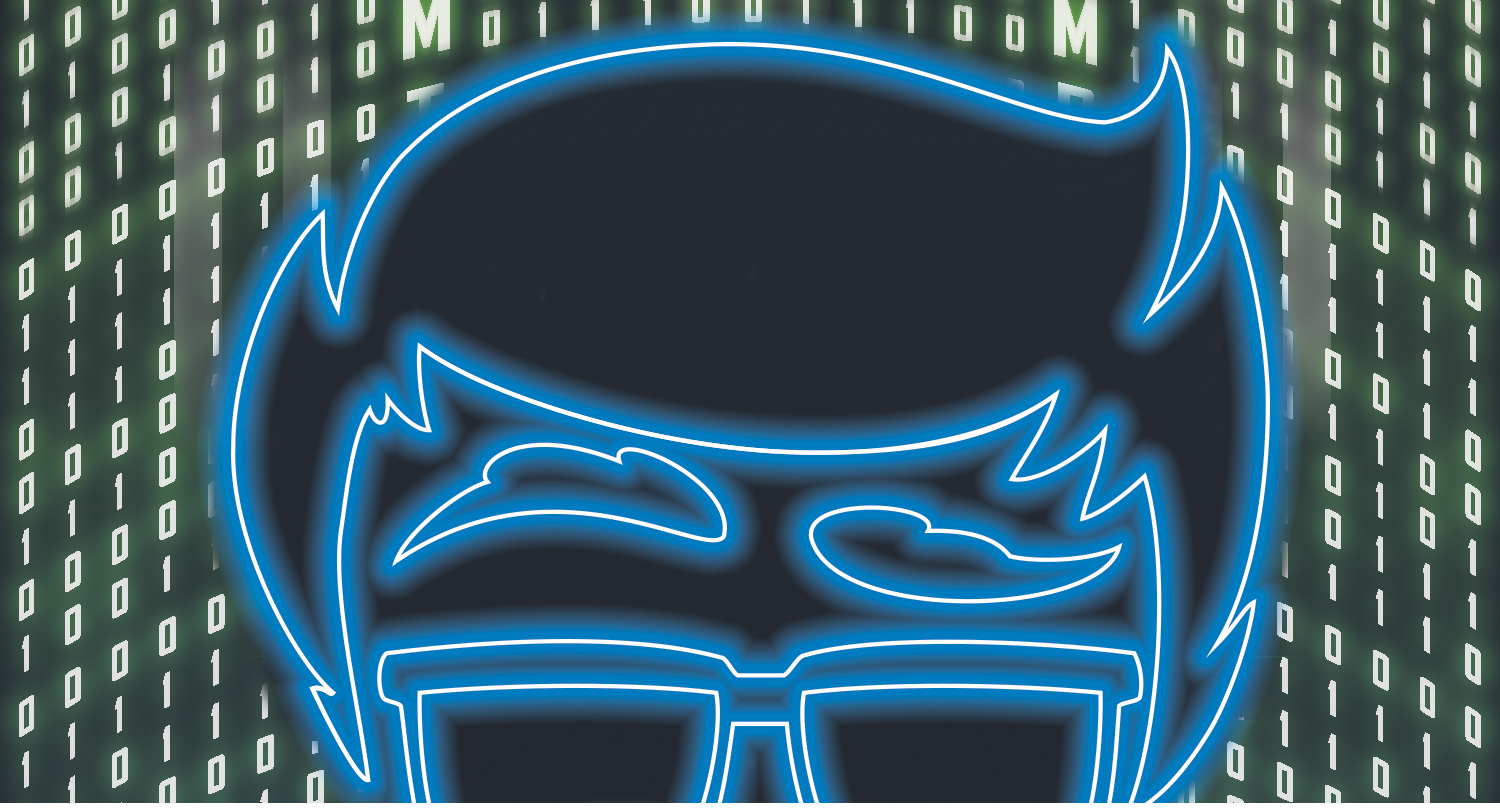 Der blaue Kopf stellt eine neutrale Figur dar. Der Farbverlauf im Binärcode von unten grün bis oben gelblich-orange zeigt, dass momentan alles gut ist, aber etwas negatives naht.