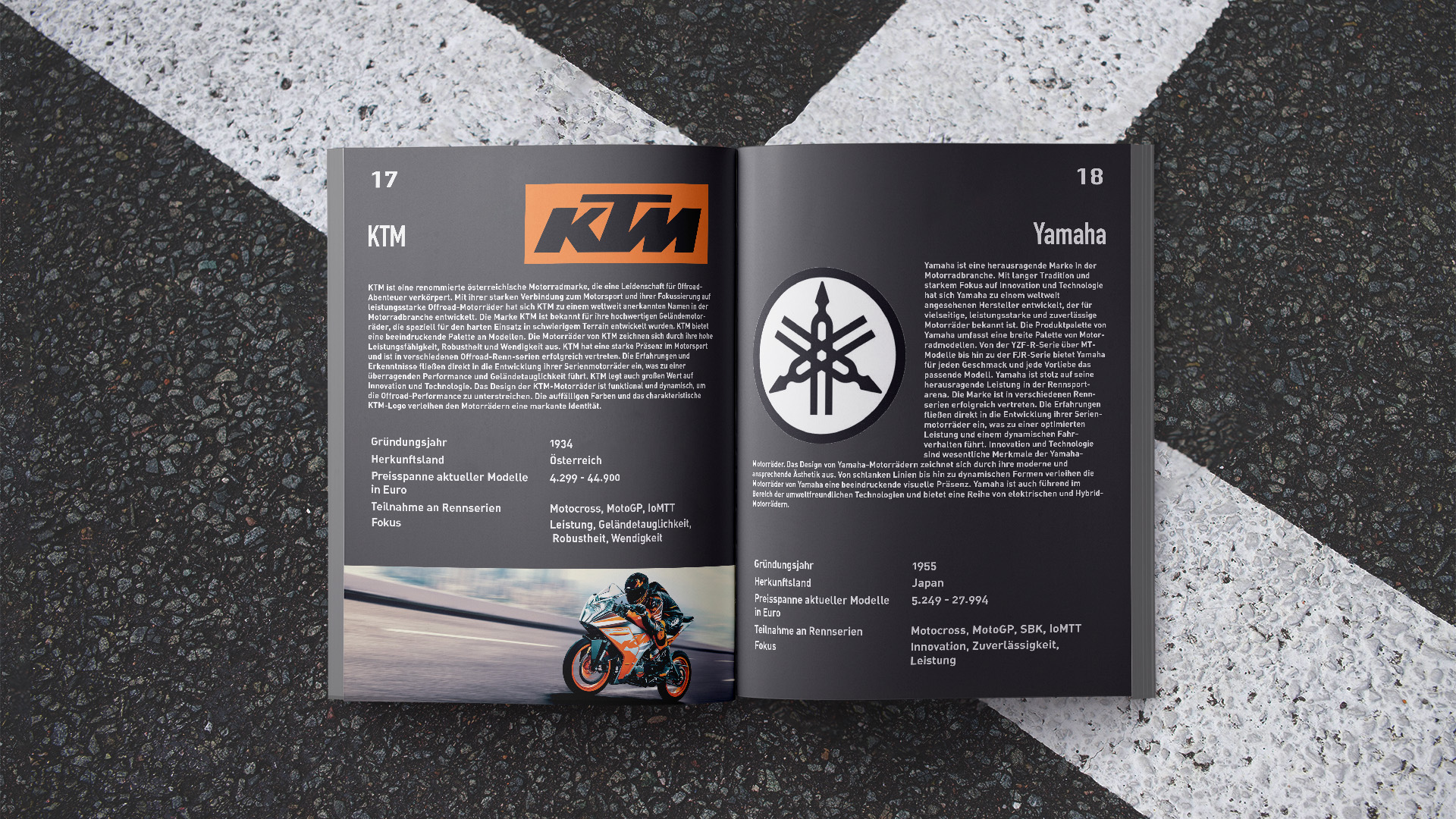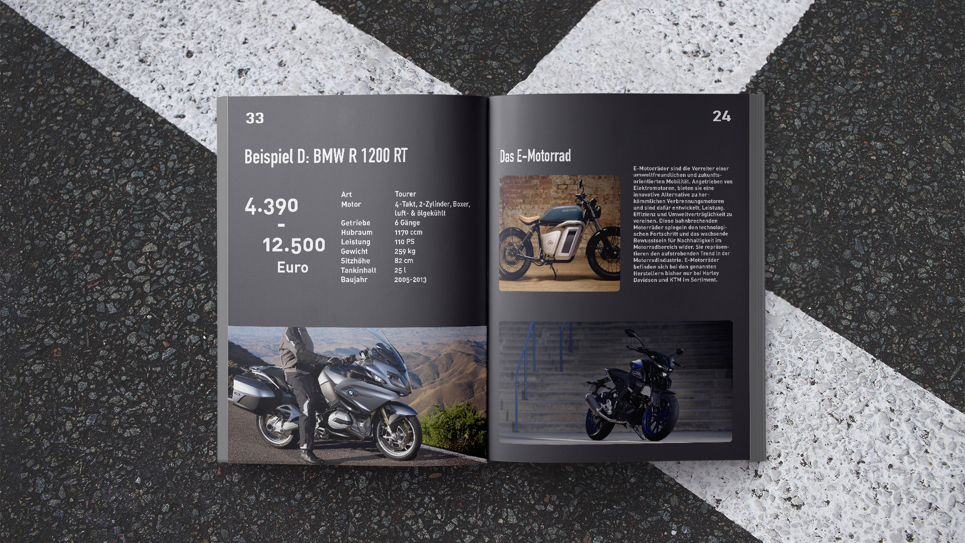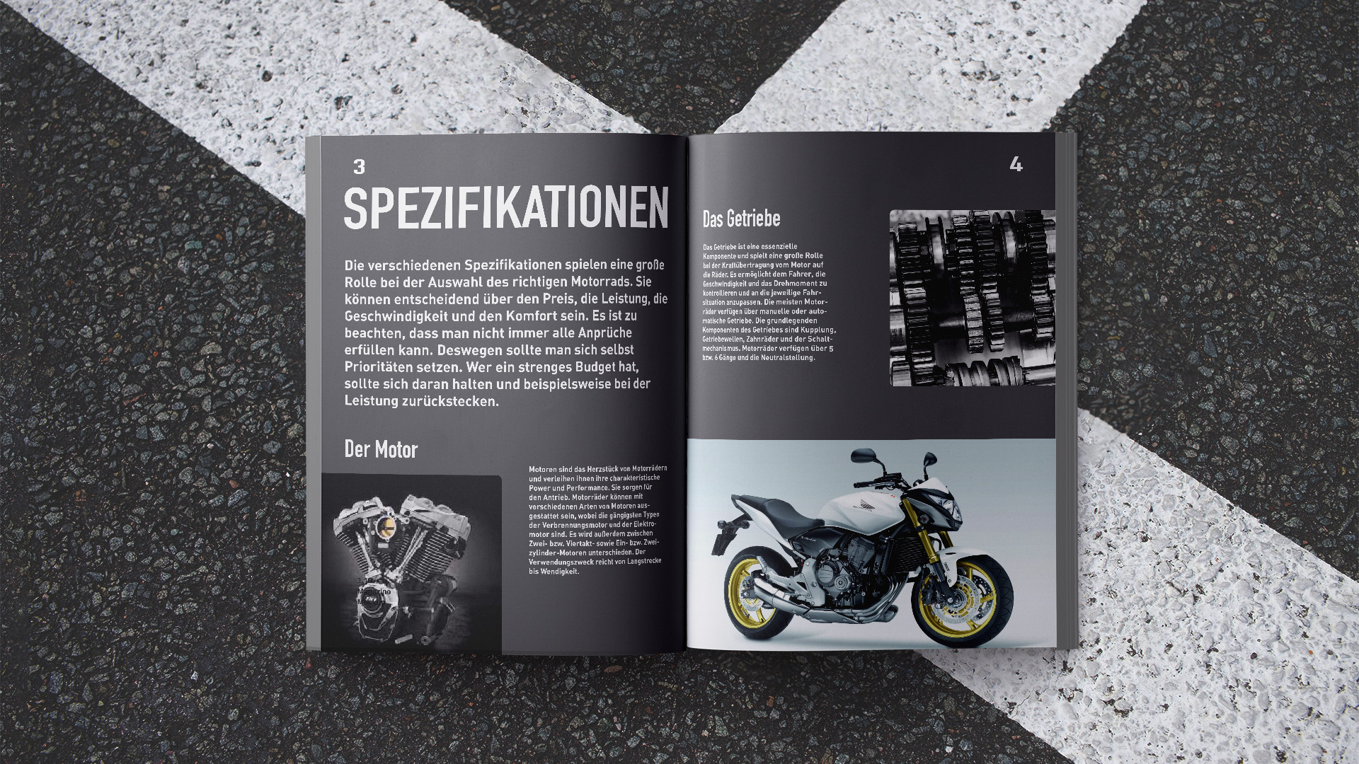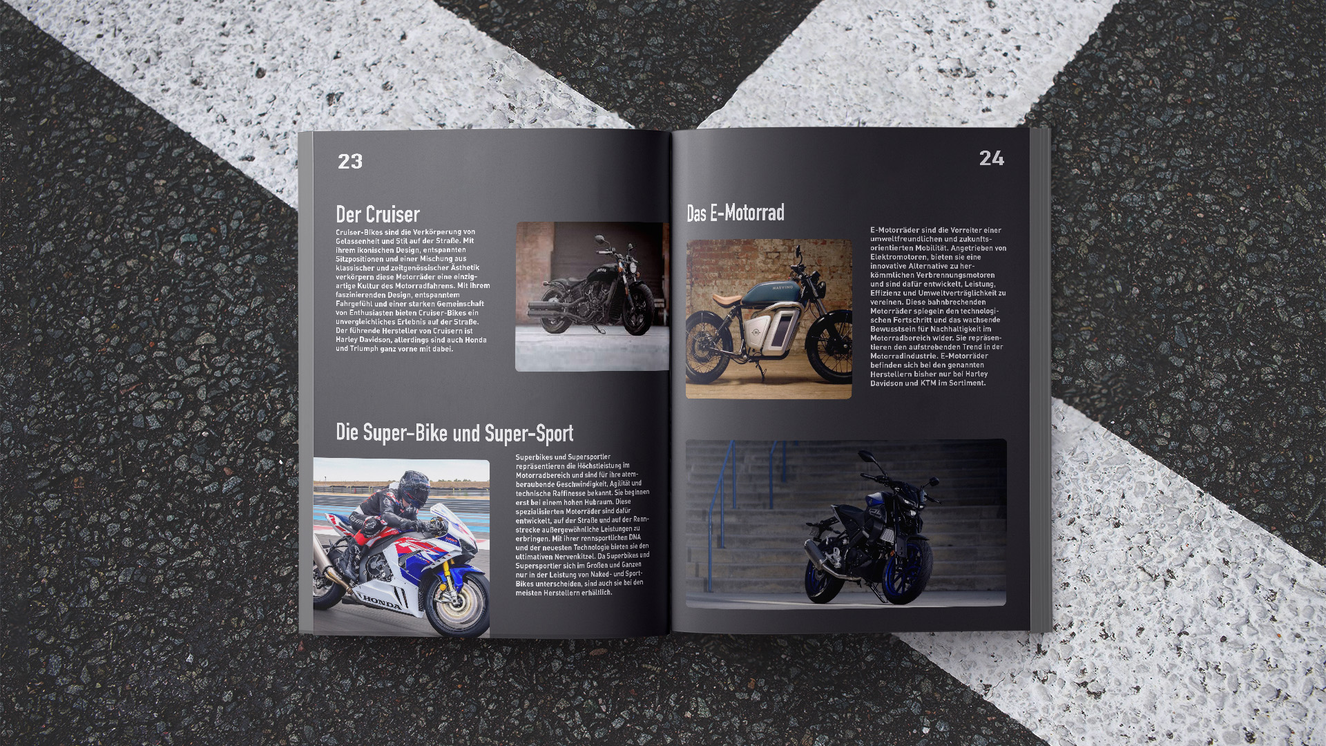 Die Eigenschaften der zehn Motorrad-Arten werden in einem kleinen Text vorgestellt. Die Arten reichen vom Naked-Bike über Supersportler bis hin zur Enduro und Chopper.