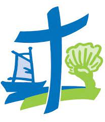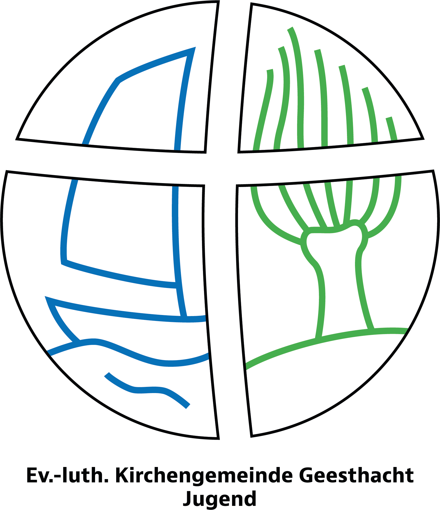 Das Jugendlogo ist eine modernere Interpretation des Kirchenlogos und setzt auf Strichgrafiken und Negativraum. Das Kreuz unterteilt nun den Kreis, in dem das Boot und die Weide stehen.