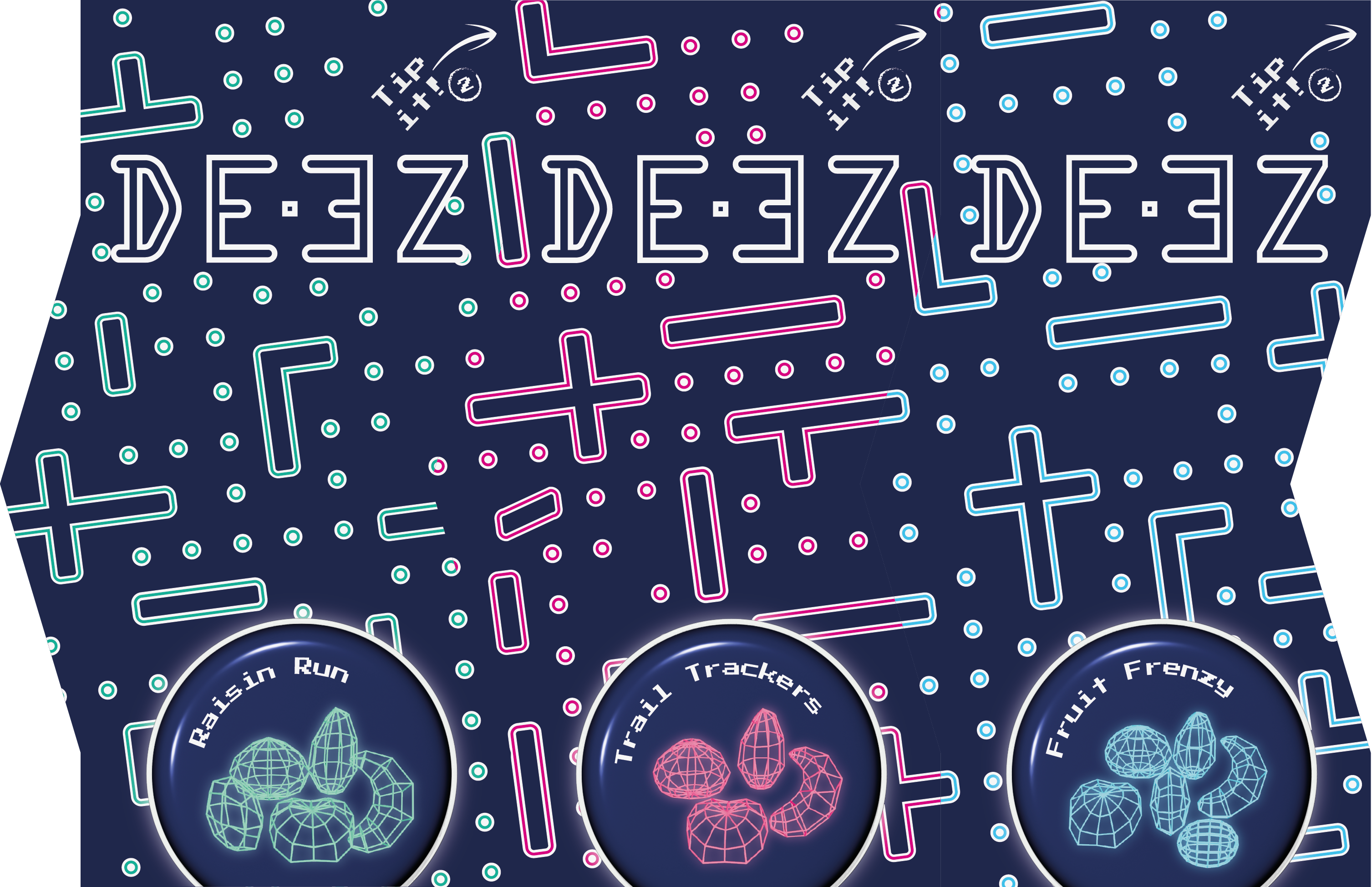 Das Design für die Mix-Sorten ist zwischen den drei Sorten fortlaufend und basiert auf dem Retro-Spiele-Klassiker PacMan.