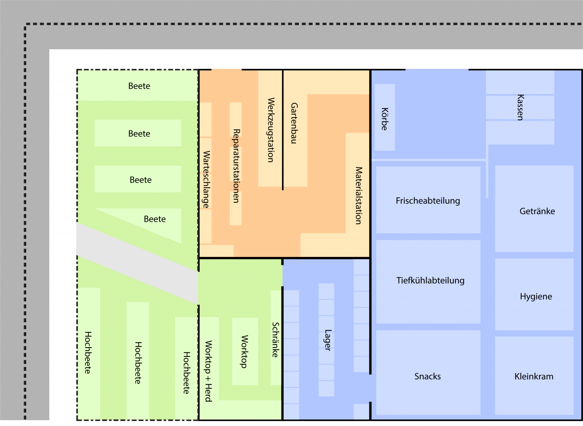 Der Grundriss zeigt den Aufbau des neuen Penny.young. Der Ladenbereich ist blau gekennzeichnet, die Werkstätten orange und Garten und Küche grün.