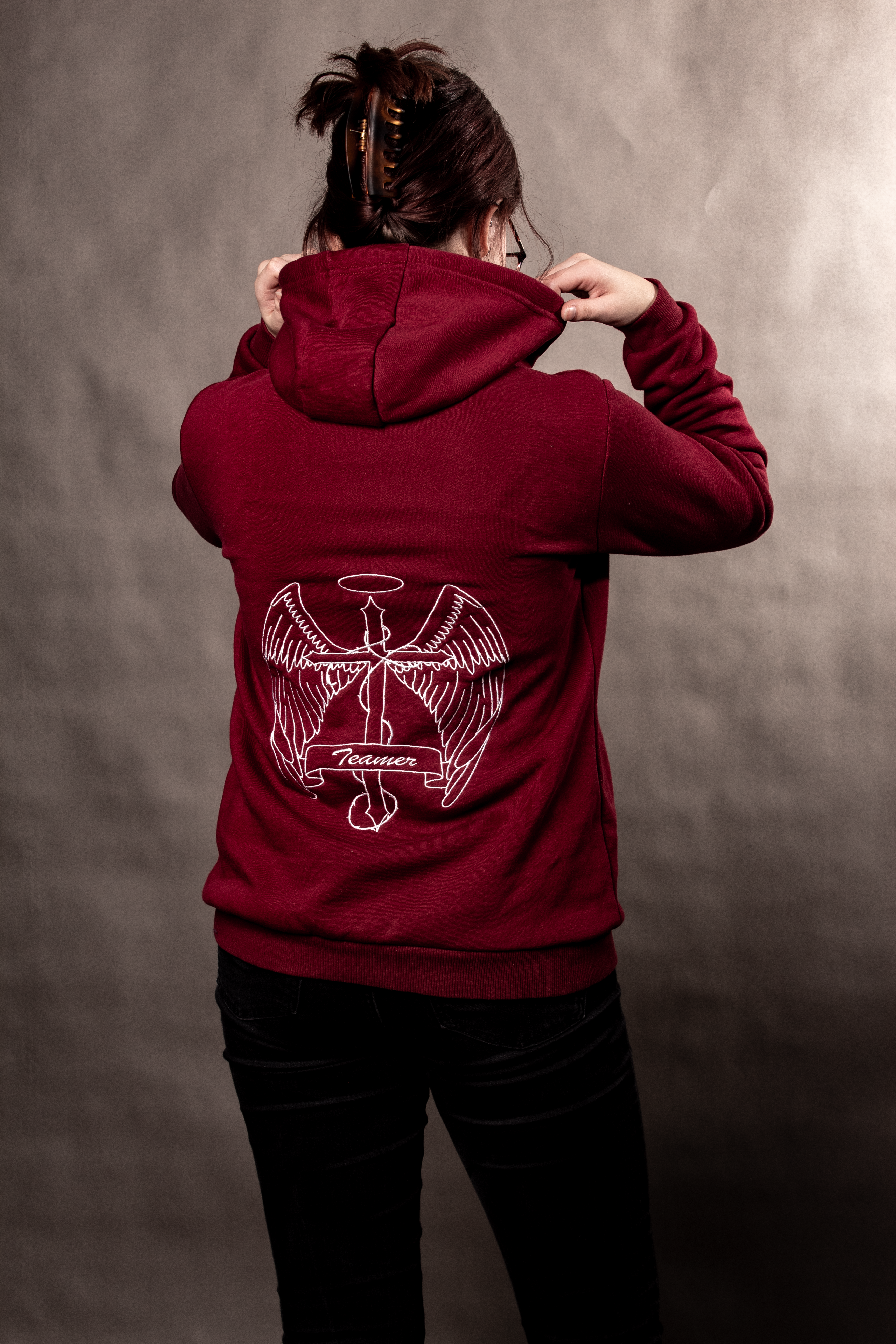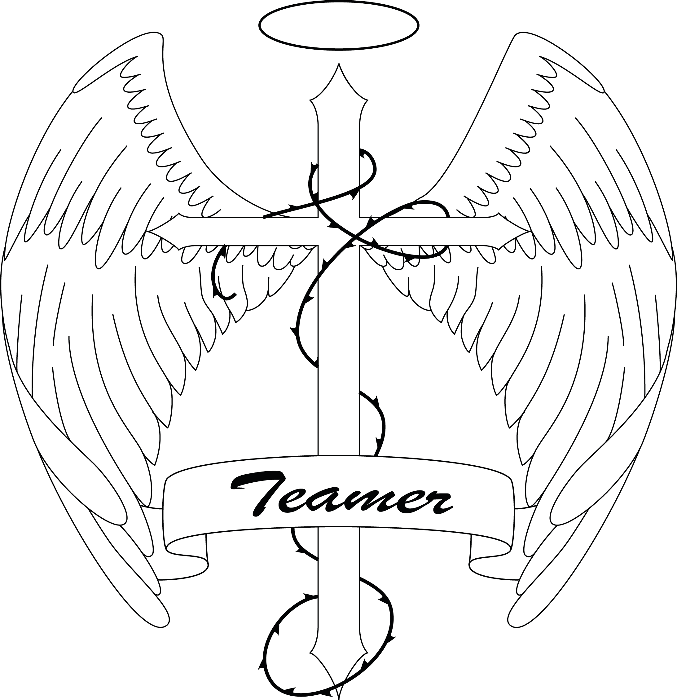 Das filigrane Rückendesign ist aus christlichen Symbolen aufgebaut. Es besteht aus einem Kreuz mit einem Heiligenschein, Engelsflügeln und Dornenranken. Im unteren Bereich steht ein wehendes Banner mit der Aufschrift „Teamer“ in einer eleganten Schrift.