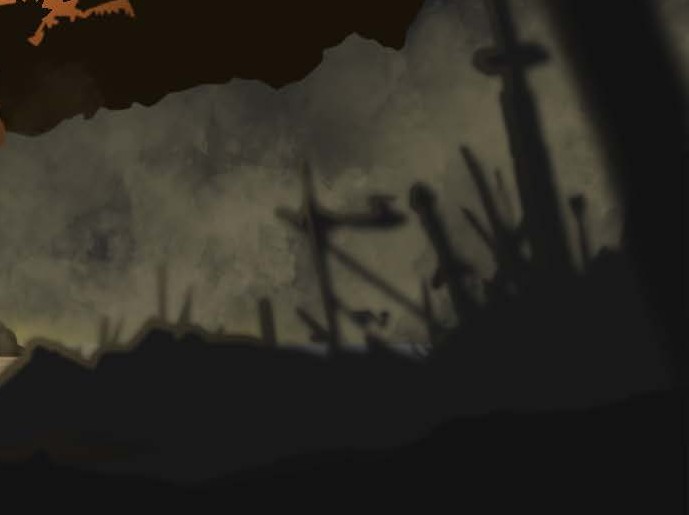 Dazu habe ich die Charaktere in einem flachen Stil nachgezeichnet, eine Hügellandschaft aus verschiedenen Ebenen erstellt und die Charaktere eingefügt. Als Ambiente wabern Nebelschwaden zwischen den Hügeln, während im Hintergrund Wolken vorbeiziehen.