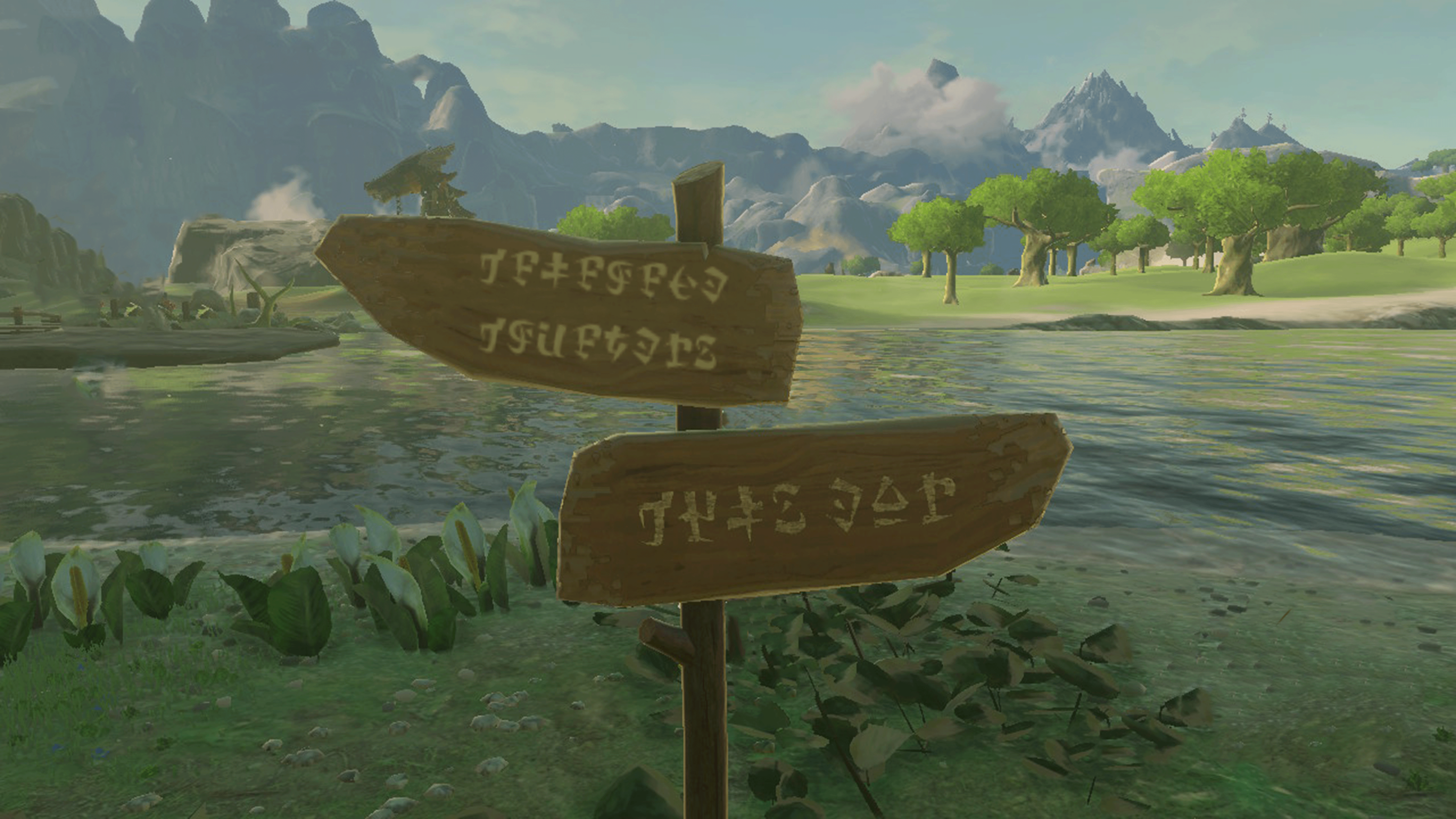 Der Wegweiser zeigt nach rechts zu einem kleinen Wald und nach links zum Stall von Triforce Journeys im Hintergrund. Die Schrift ist dem Universum entsprechend.